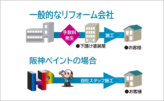 阪神ペイントは品質重視のため、 自社職人による施工にこだわっています。それに加え無駄な出費がなく、低価格でご利用いただけます